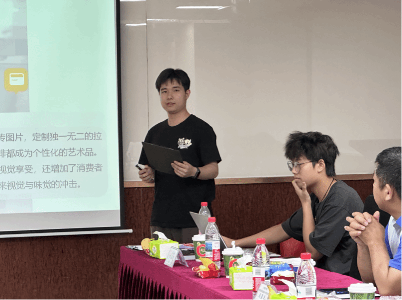 “头号玩咖”AI拉花咖啡机项目学生代表则介绍了该团队独创的“咖啡AI拉花技术”。团队同学该项目从市场分析、目标人群定位到商业模式设计,全方位展示了项目的创新性与技术可行性。该项目通过依托AI拉花技术打造智能咖啡产品,以技术革新瞄准年轻消费市场,发展潜力无限,赢得与会校企双方老师和领导们的一致好评。