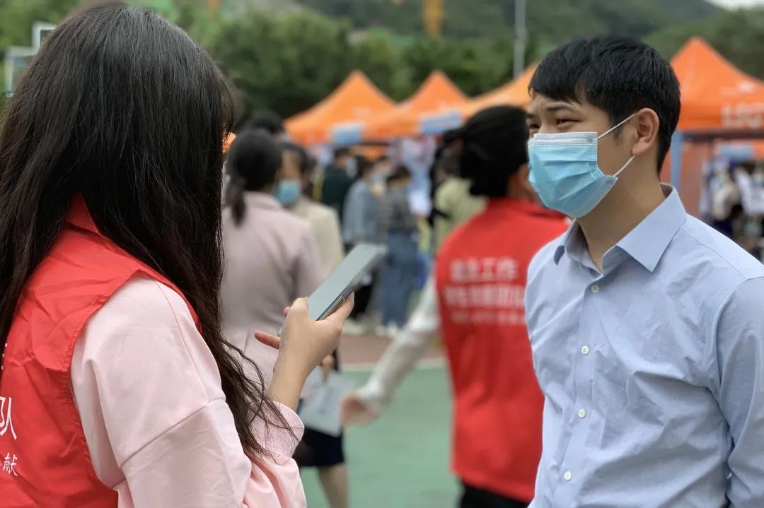 招聘会开始,应聘者早早地在体育馆门口,排成长队现场签到,接受工作人员的体温检测。队伍中有在整理简历为面试做准备的同学,也有在调整心态的同学,大家都在期待属于自己心仪的offer。前来应聘的学生大都身着正装,手持精心准备好的简历,满怀憧憬。