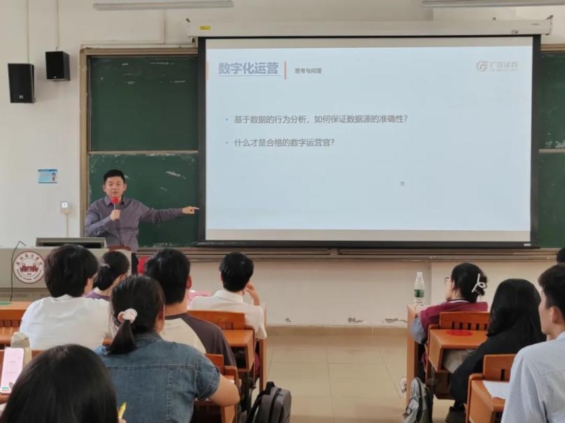 在充分调动了在场同学们的学习热情和兴趣后,蔡斯煜经理以广发证券为例,详细阐述了金融机构数字化发展的战略和战术内容。由此衍生出的新型工作岗位——数字运营官,与金融科技岗位其实差别很大。未来的金融机构必然需要的是更多的既懂金融业务,又懂数字化分析与运营的复合型人才。最后,蔡斯煜经理介绍了广发证券的招聘流程,并对同学们未来的职业规划提出了不少宝贵的建议。现场的同学们互动频繁,学习气氛热烈。