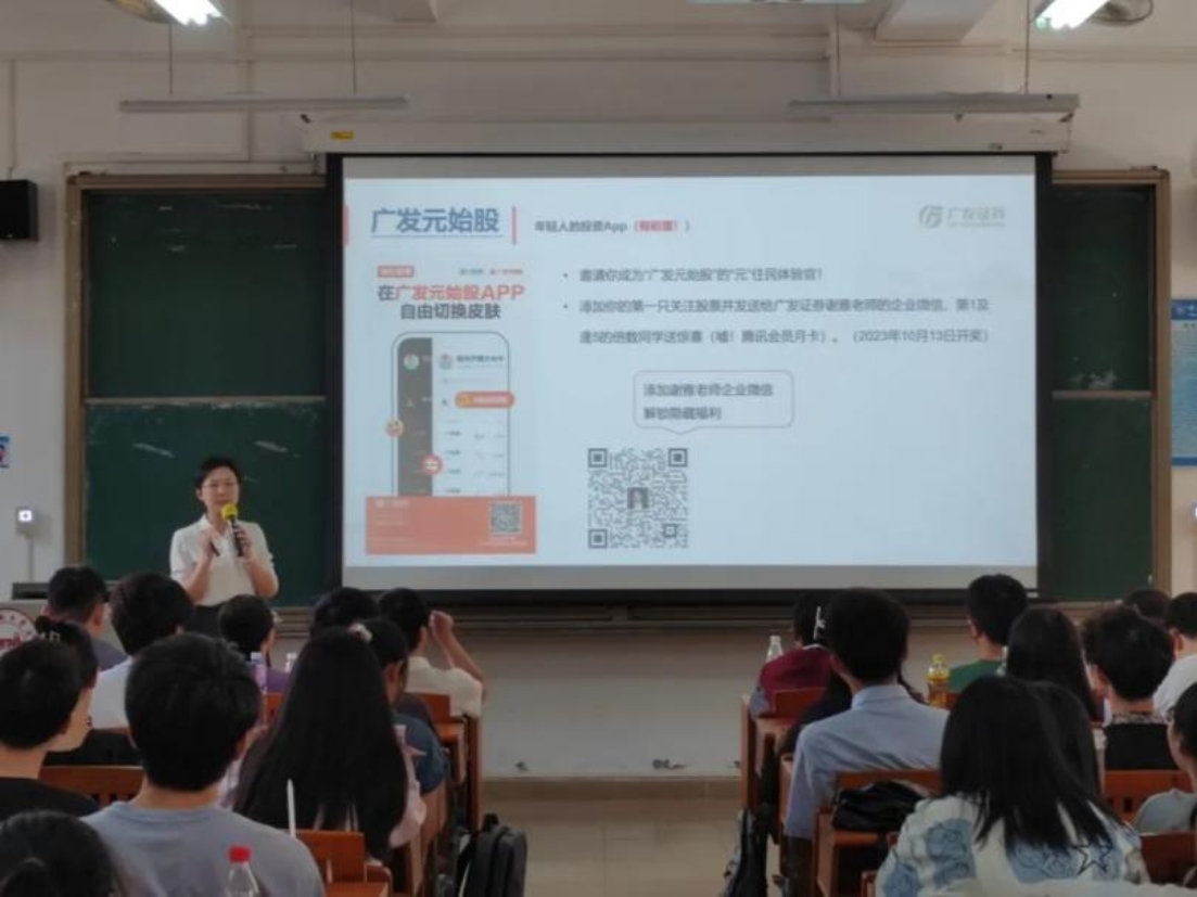 讲座的第二个环节,谢雅经理为大家带来互动小游戏,邀请大家做“原始股元”app原住民的体验官,激发同学们加入金融机构数字化发展潮流的兴趣。广发证券在数字化转型中,专门开发出针对年轻人群适用的数字化APP。谢雅经理表示,希望同学们试用后反馈意见和建议,也可以通过使用这款APP来及时获取金融资讯,寓学于玩,取得进步。