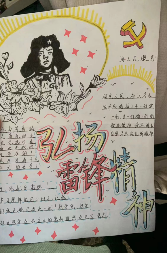 在团支部的号召下,团员学生充分利用好宣传阵地,绘制雷锋手抄报,并在一笔一画中学深渐悟雷锋精神。在手抄报当中展现雷锋形象,歌颂雷锋“全心全意为人民服务”的高尚品质,展示了自己对雷锋精神的感悟和理解。