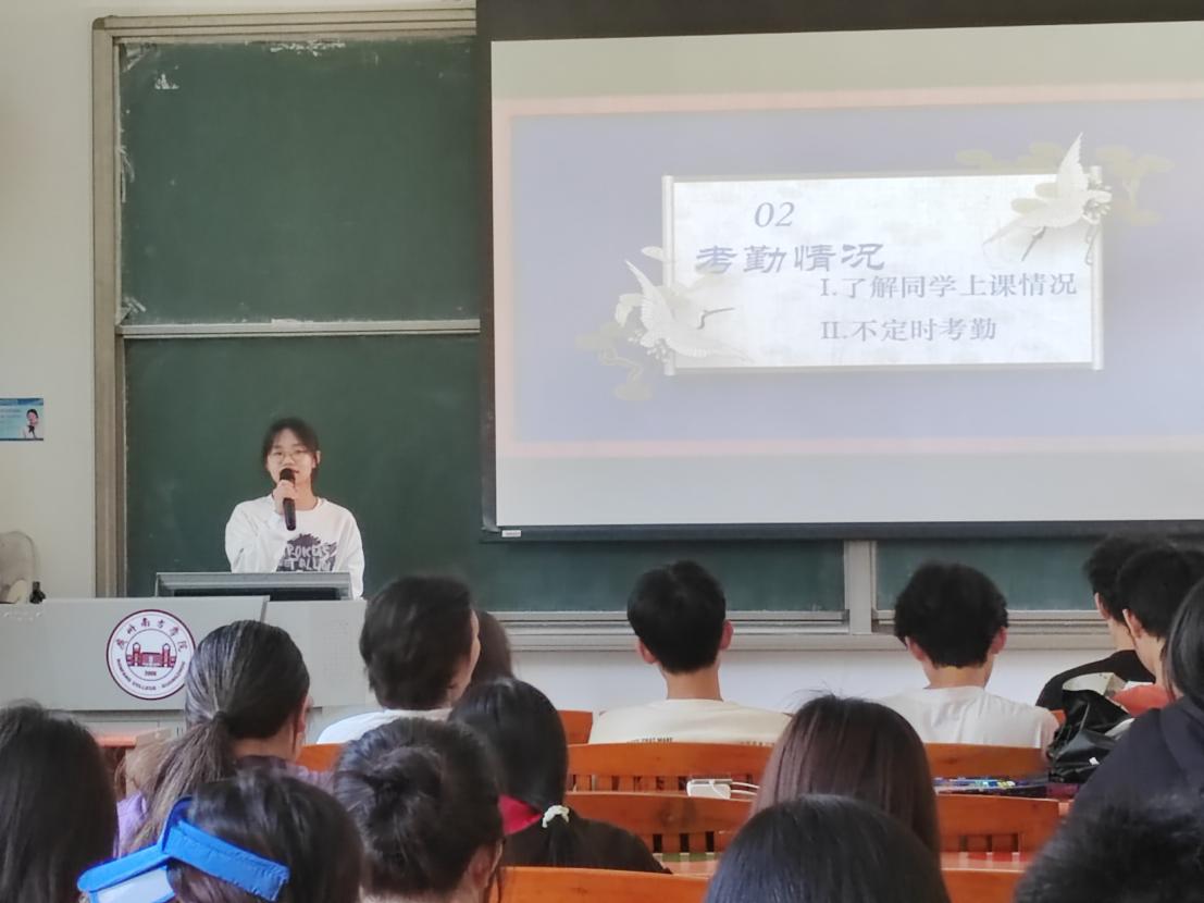 由电商2班班长叶惠同学向大家讲述了上课考勤情况。校有校纪,班有班规,按时认真完成每一堂课的学习是作为学生最基础的本职。关于考勤不可旷课、缺勤、不来等情况,有事必须提前请假,班委将及时跟进班级考勤情况,届时学院也会不定时对课堂考勤情况进行检查。若每个人都能做好自己本分,那么规则并不是枷锁的代名词。