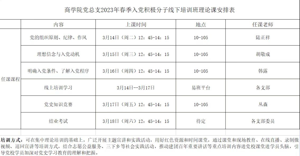2023年春季入党积极分子的学习时间安排如下,上课地点将另行通知,请各支部入党积极分子安排好时间,准时参加课程及考试。