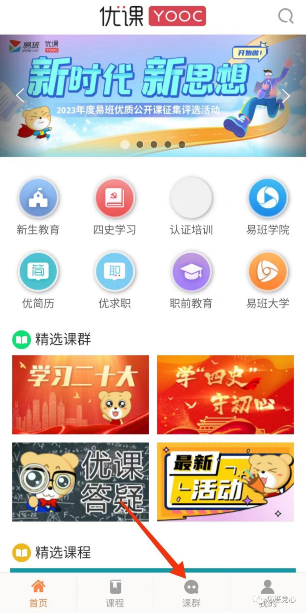 文字说明:下载易班App并注册→登录进入易班→点击主页面右下角“我的”→进入个人页面后点击“易班优课”→进入优课YOOC后点击右下方“课群”进入课群主页→在课群主页中点击“添加课群”→在添加课群中搜索邀请码2RZMZ5MG加入课群→加入各自对应的党支部→完成后在课群首页就可以看到线上的课程。