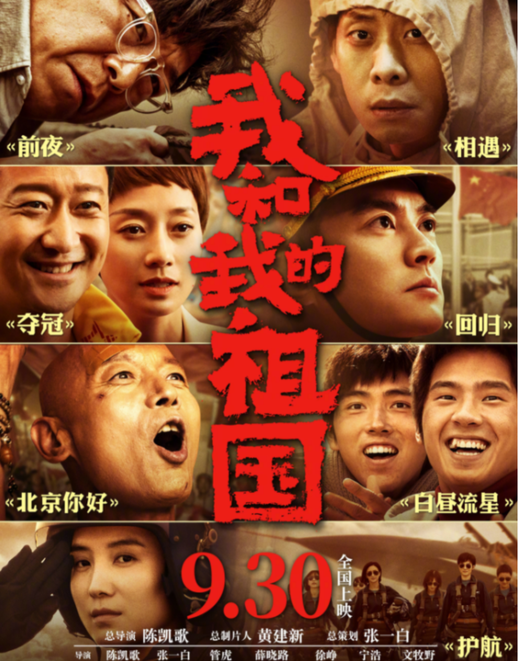 《我和我的祖国》是由《前夜》、《相遇》、《夺冠》、《回归》、《北京你好》、《白昼流星》和《护航》七个独立不同的故事组成,每个故事又按照时间的顺序相互联系在一起。整部电影展现了新中国70年来的壮阔历史,讲述祖国精彩时刻背后最普通平凡中国人的故事。