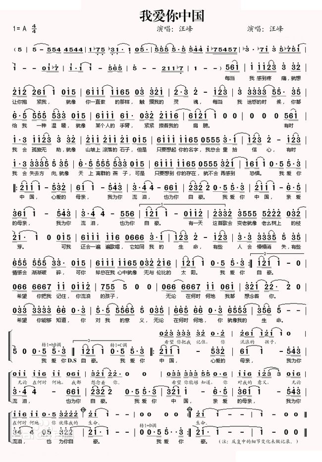 副歌反复唱出“我爱你中国心爱的母亲,我为你流泪也为你自豪”,强烈表达了对祖国的热爱以及中华儿女对祖国满腔炽烈的爱国主义情怀。整首歌词是宏大的爱国叙事,充满希望、充满力量、充满抗争、永不放弃的信念,让挫败的人都能得到向上跋涉的力量,沮丧的人都能得到精神温暖。整个旋律优雅富有诗意,曲调起伏迂回,节奏自由悠长。既有深情的告白,又有清新真挚的旋律语言,表达了亿万中华儿女对祖国的真挚热爱和对祖国母亲的由衷赞美!
