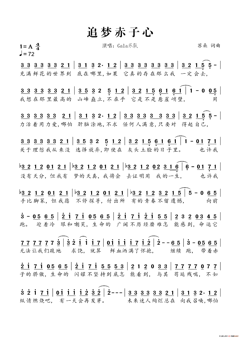 《追梦赤子心》由苏朵谱曲填词、甘虎编曲、GALA乐队演唱。该曲通过将自己抛出去的唱法,以及源自Neil Young的“与其苟延残喘、不如纵情燃烧”的热血情怀,表达出人们为了理想主义甘愿抛头颅、洒热血的气势。它没有批判和深邃,却不缺死磕与抗争。这首《追梦赤子心》,更像是中国摇滚版的《阿甘正传》。GALA乐队在这首歌中用撕吼式的演唱方式表达了对于梦想的执着追求与坚持向往。歌曲中饱满的情绪,仿佛唱出了每个追梦人的心声,励志的同时也使人瞬间充满正能量。