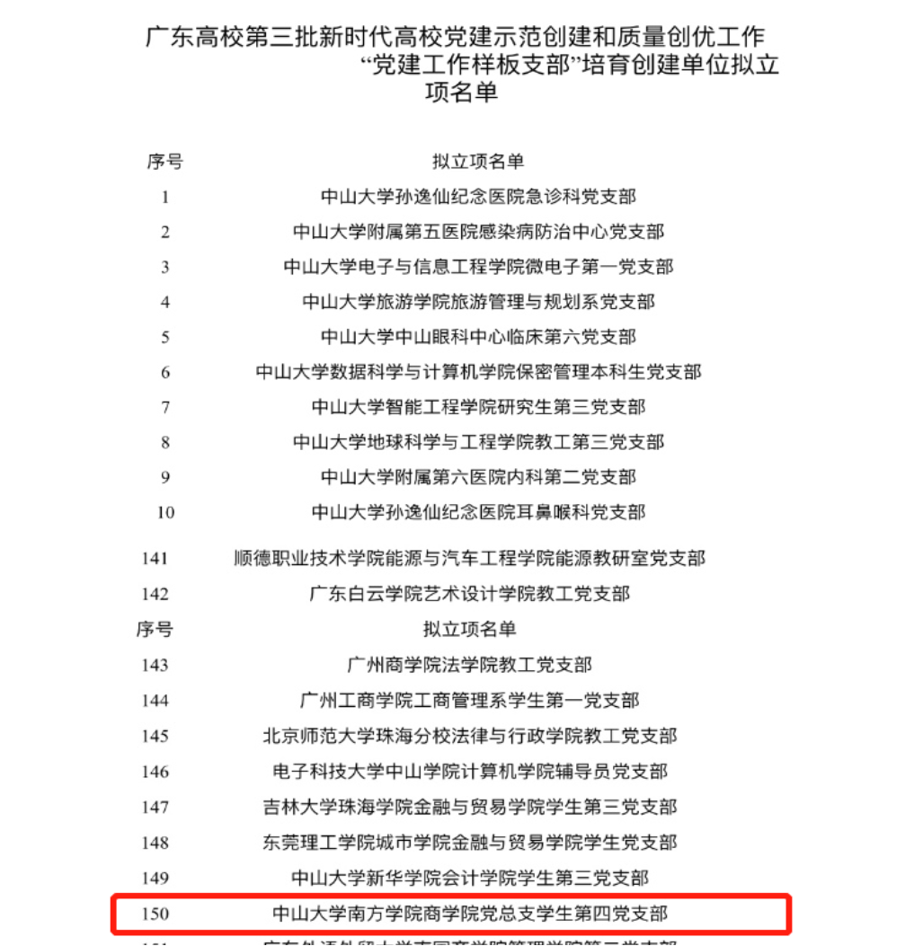 2020年12月7日,中山大学南方学院伟德国际1949始于英国学生第四党支部在“广东高校第三批新时代高校党建示范创建和质量创优工作‘党建工作样板支部’培育创建单位拟立项名单”中光荣上榜。