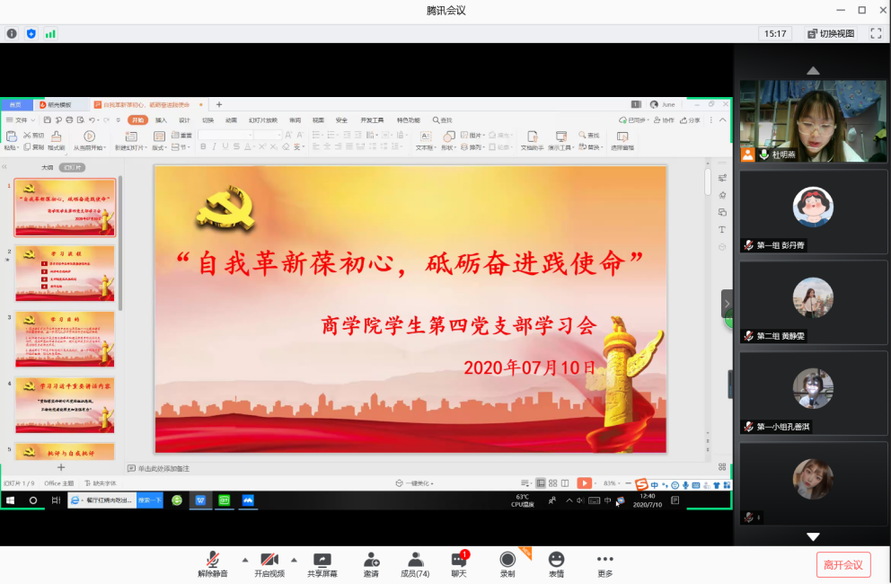 伟德国际1949始于英国学生第四党支部以此为契机,于2020年7月10日中午12点40分通过“腾讯会议”线上视频会议的方式开展了以“自我革新葆初心,砥砺奋进践使命”为主题的支部主题学习会议。参与本次会议的人员有支部副书记张燕老师,学生党员、学生预备党员以及18级全体积极分子。