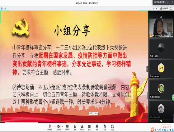 会议的最后一项议程——小组学习心得分享,由每个小组选派一名代表对此次学习进行学习心得分享。五四运动所孕育出来的“五四精神”已经成为中国每个时代的青年努力奋斗、不断进取的形象符号。时代虽然在变,但是五四精神却从未变过,五四精神的精髓世代相传。每个时代的青年人都有对“五四精神”不同的诠释。当今,举国上下刚经历了一场与新冠病毒的严峻战争,并将持续保持战斗,全国青年们在这场战“疫”中发挥了青春的本色,挺身而出,不畏艰险。