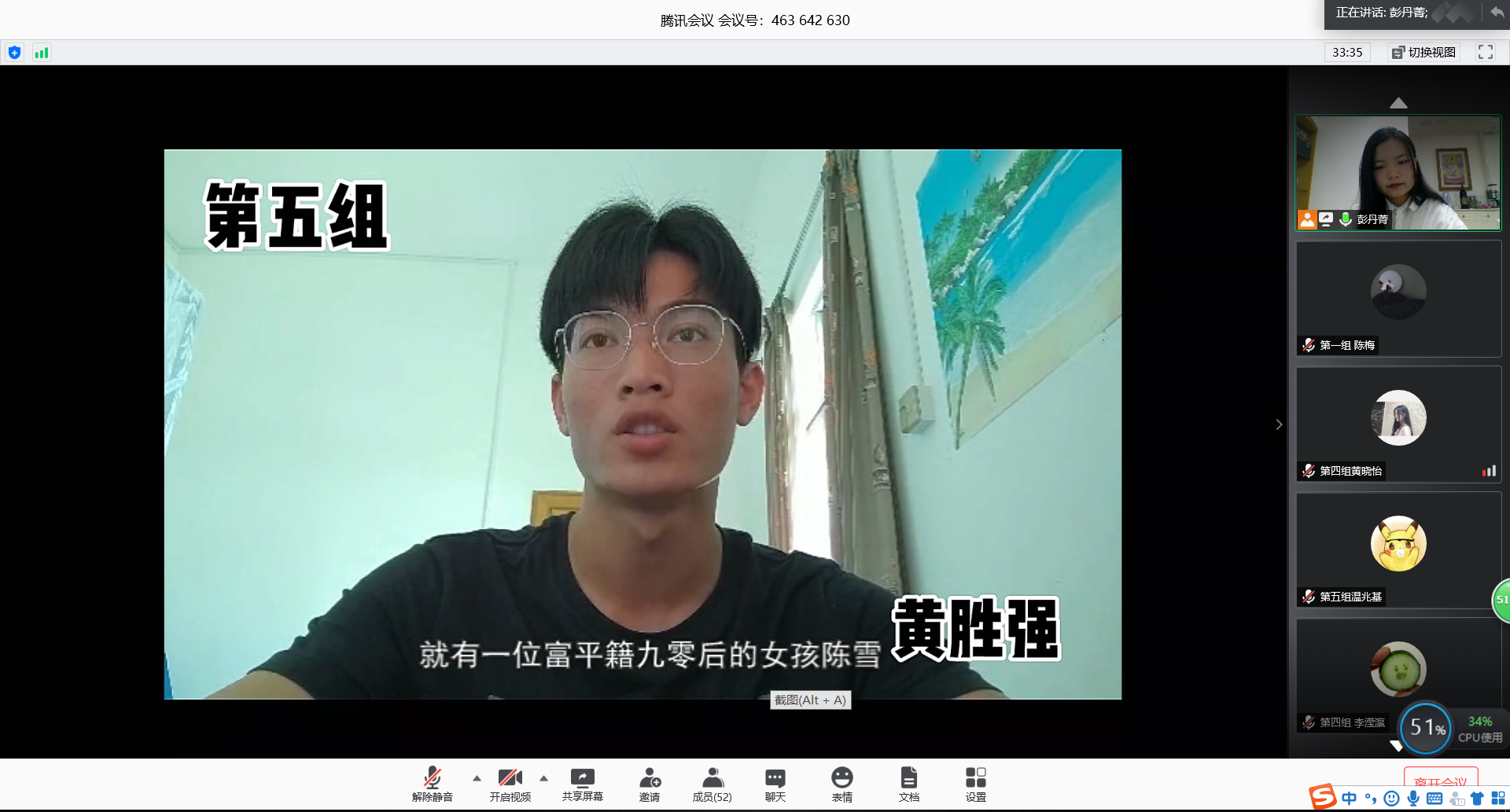 会议的第二项议程——小组分享。该环节分为两个部分内容:青年榜样事迹分享与诗歌朗诵。由每个小组选派代表,采用线下录制视频的方式进行分享。在青年榜样事迹分享环节中,每位代表围绕为国家发展、疫情防控等方面中做出突出贡献的青年榜样事迹进行分享。通过这一讲述青年榜样故事环节,充分发挥榜样教育的独特作用,激励与会人员学习模范先进人物,激发厚值家国情怀与责任意识。