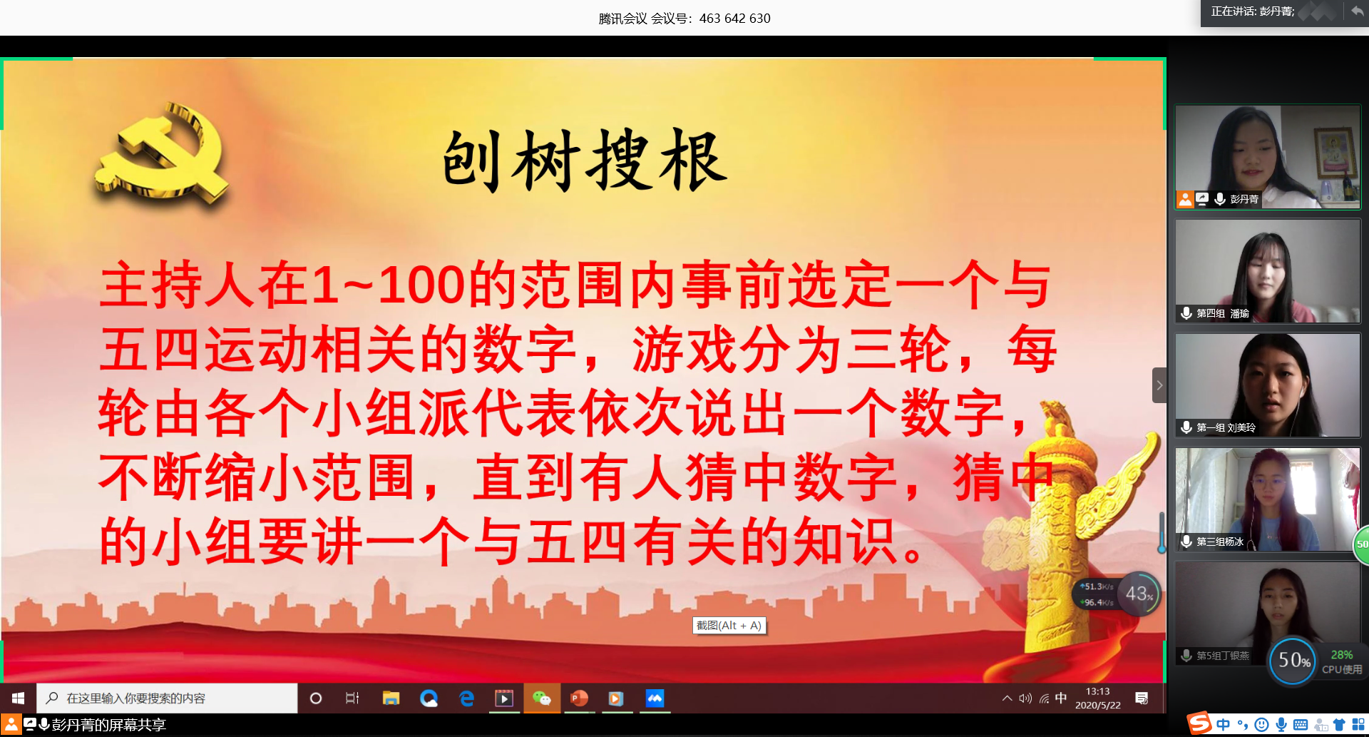 会议的第三项议程——游戏“刨数搜根”。主持人首先在1-100的范围内事前选定一个与五四运动相关的数字,接着由各个小组派代表依次说出一个数字,不断缩小范围,直到有人猜中数字为止,猜中的小组则要讲一个与五四有关的知识。通过该游戏环节,与会人员会更深入地了解与五四运动相关的知识,更加明确新时代所担当的使命与责任。