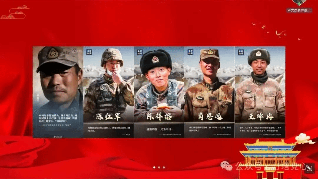 紧接着,卢文杰同志以《英雄的加勒万》歌曲作为引入,带领党支部成员们回顾了2020年6月发生的加勒万河谷冲突事件。通过分享英雄们的战斗日记,请战书内容以及其他士兵的战场回忆的方式,从一个全新的角度让党支部成员们更加深刻地了解英雄,敬仰英雄,怀念英雄。英雄们在面对敌人时的坚定信念和无畏勇气,充分展现了官兵们上下同欲、生死相依的精神。是他们的牺牲和奉献,换来了国家的安宁和稳,也激励着党支部成员们勇担使命,为国家的发展贡献青春力量。