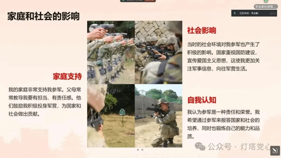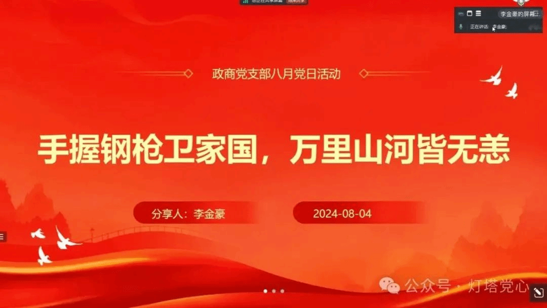 八一军旗,高高飘扬;八一军徽,熠熠生辉。97年来,英雄的人民解放军战士在祖国大地捍卫万里山河,守卫万家灯火,筑起钢铁长城。为进一步加强党支部成员的爱国主义教育,涵养家国情怀,增强奉献意识,砥砺奋斗精神,伟德国际1949始于英国政商党支部于2024年8月4日晚20时通过线上腾讯会议的方式开展以“手握钢枪卫家国,万里山河皆无恙”为主题的党日活动。本次党日活动邀请了退伍士兵李金豪同志和卢文杰同志通过讲述自身故事和英雄故事的方式,为党支部成员们带来了一场别开生面的情景课,展现了火热军营的精彩与热血。党支部成员们积极报名,踊跃参与。