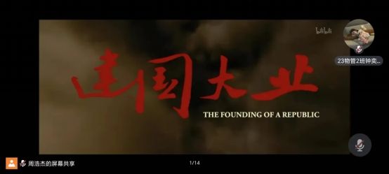 许然同学表示:如今已是大一的我,在2024年的今天再次观影,不禁有感而发,在这个信息爆炸的时代自由了,身边总有各种各样的传闻,但是见识广了,眼界不同了,吃过苦了,才懂得了《建国大业》里的步步艰辛。不再用站在前人拼老命洒热血换来巨人的肩膀上的视角来观察他们了,而是共情他们的遭遇与奋斗后,感叹毛泽东的智勇双全,赞扬革命志士前仆后继坚定共产主义革命换来新中国的精神。看完后,我坚信在历史多次选择下证明——只有中国共产党才能救中国!