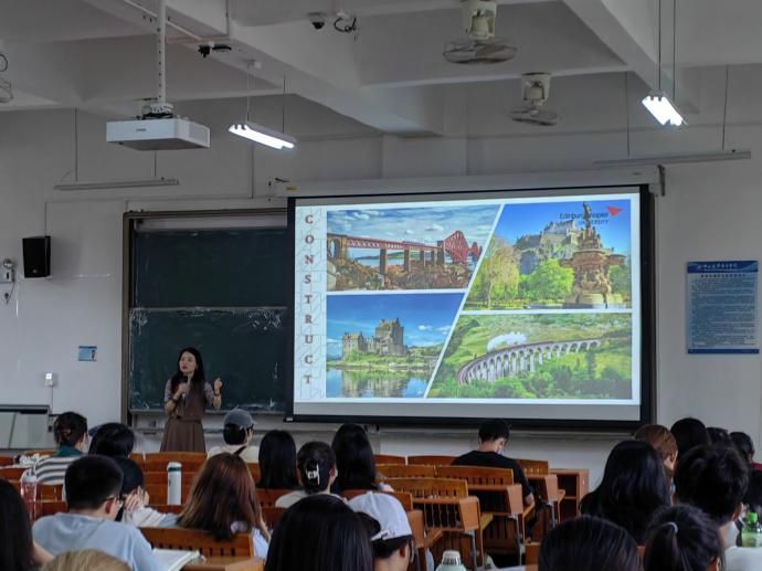 此次宣讲会主要分为大学背景介绍、英国人文历史分享以及夏令营项目介绍三个环节。首先,萧裕中老师作为主持人进行开场致辞,而后廖老师通过播放一段音乐MV,让同学们对爱丁堡的风景环境有了初步的印象。作为苏格兰首府,爱丁堡是世界上最吸引人的地方之一,也是国际上公认的旅游胜地。这座城市有多种多样的就业机会,加上爱丁堡龙比亚大学与行业引以为豪的成功合作经验,使其成为一个非常适合学习、工作和生活的地方。