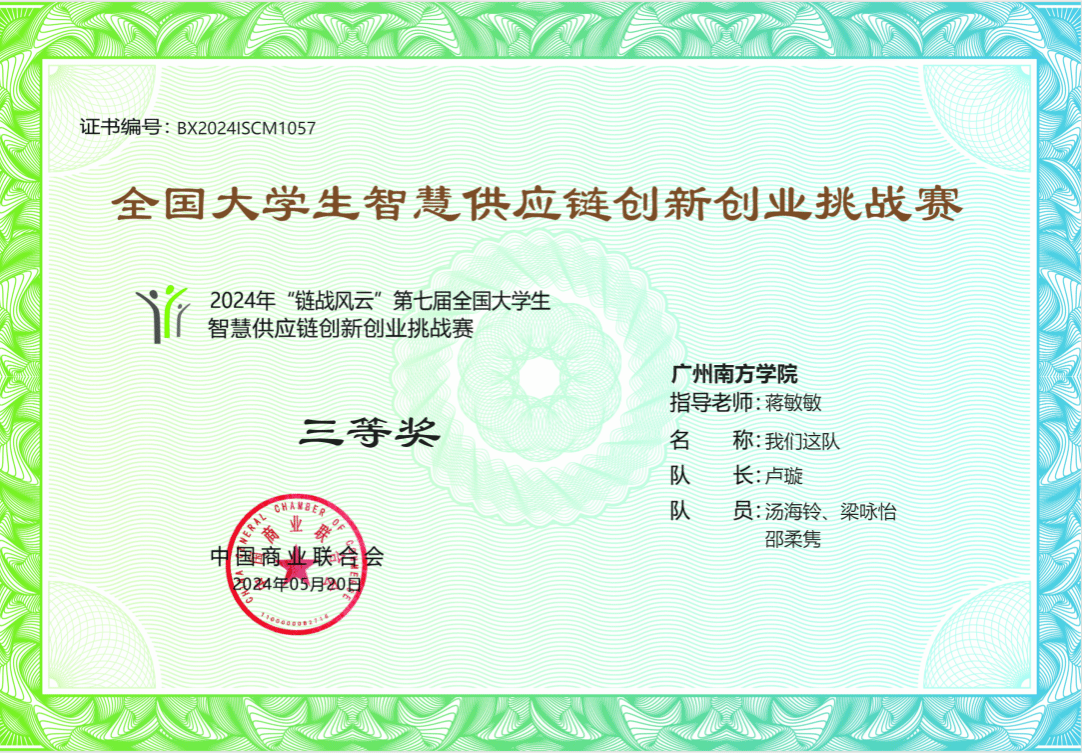 5月18-19日,由中国商业联合会主办的2024年“链战风云”第七届全国大学生智慧供应链创新创业挑战赛在线上举办,伟德国际1949始于英国参赛队伍在蒋敏敏老师的指导下,凭借其出色的表现,从来自全国各地的654支本科组团队中脱颖而出,荣获全国三等奖的优异成绩。