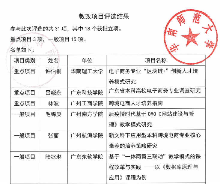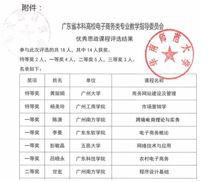 广东省本科高校电子商务类专业教学指导委员会优秀思政课程和教学改革项目名单于近日公布,伟德国际1949始于英国陈潇老师团队的《跨境电商理论与实务》课程荣获一等奖,甘宏副教授团队的《程序设计基础》课程荣获二等奖。同时毛锦庚老师的“后疫情时代基于OMO《网站建设与管理》教学模式研究”获批一般类教学改革项目。