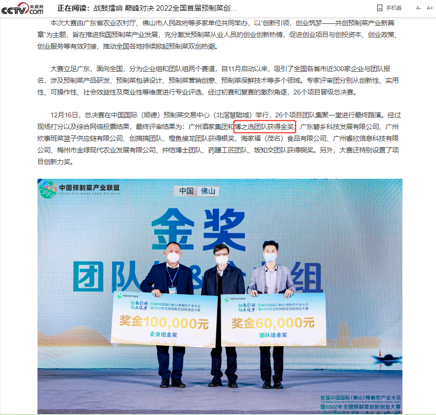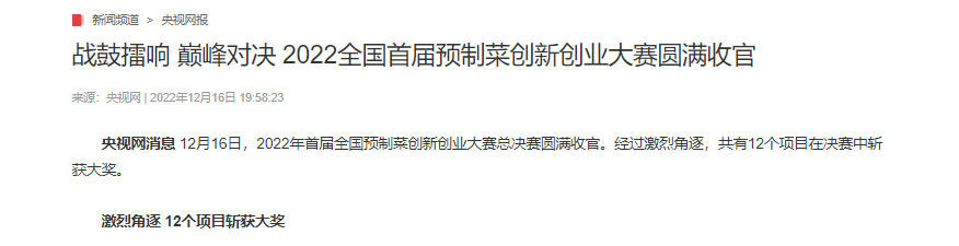 12月16日,2022年首届全国预制菜创新创业大赛总决赛圆满收官。经过激烈角逐,伟德国际1949始于英国博之选团队获得首届全国预制菜创新创业总决赛金奖。