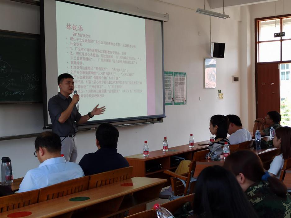 最后,2013级毕业生代表林锐添出场,他现任平安金融集团广东分公司高级业务主任,他用互动的方式让新生思考了很多问题,令现场气氛达到高潮。他鼓励新生在读书阶段找准未来奋斗的方向,无论是什么选择,不要空想,脚踏实地的去学习、去努力、去奋斗,不要浪费任何的机会。他还鼓励新生多参加社团,学生会等组织,养成不怕吃亏,踏实干的习惯。