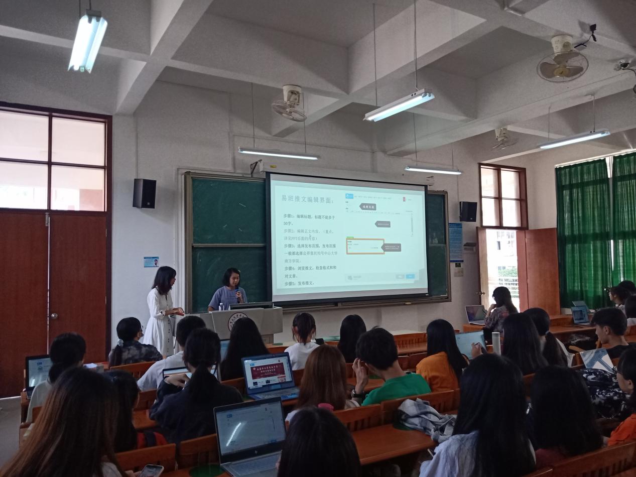 紧接着由冯俊阁同学进行有关培训,讲解如何创建与使用优课。冯俊阁同学采用边教边示范的教学方式从易班app的功能、管理、数据管理、轻应用四个方面由简单到复杂层层深入进行讲解,展示易班的操作流程及具体的方法,同学们也在边学边操作中逐渐掌握核心知识。在到讲解数据管理与轻应用的时候,为了让同学们更好更快的熟悉易班操作,张燕老师与易班工作人员则亲身教学,指导学生各项操作。