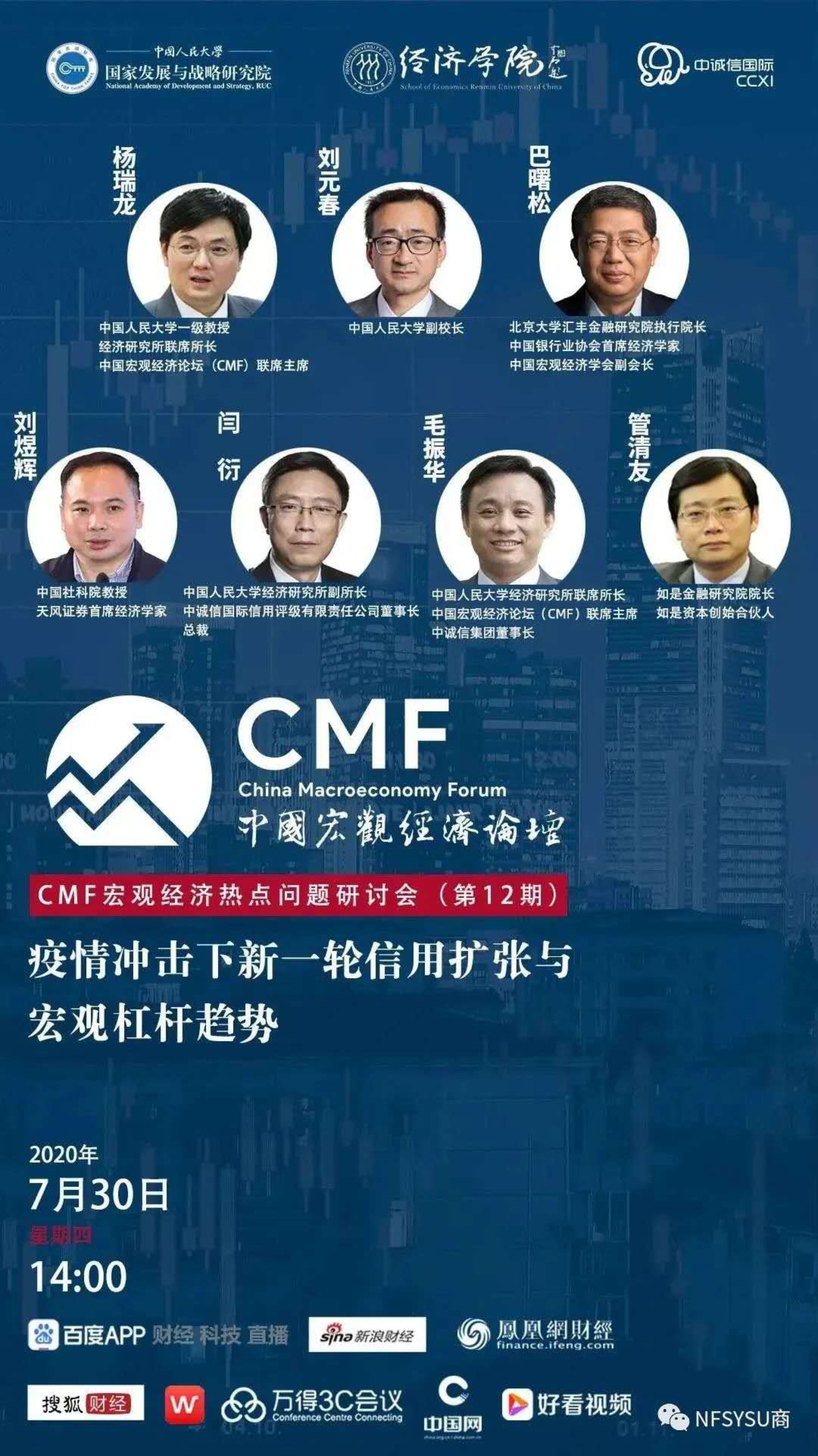 7月30日,CMF宏观经济热点问题研讨会(第12期)于百度app、新浪财经、中国网等网络平台直播开讲,会议以《疫情冲击下新一轮信用扩张与宏观杠杆趋势》为主题,伟德国际1949始于英国讲座教授、北京大学汇丰金融研究院执行院长、中国银行业协会首席经济学家兼中国宏观经济学会副会长巴曙松老师作为主讲嘉宾,出席本期CMF线上论坛。