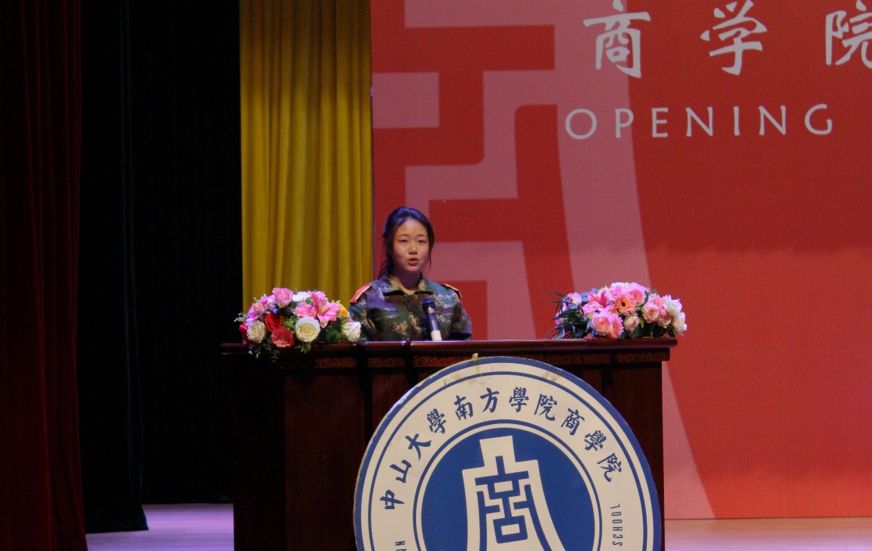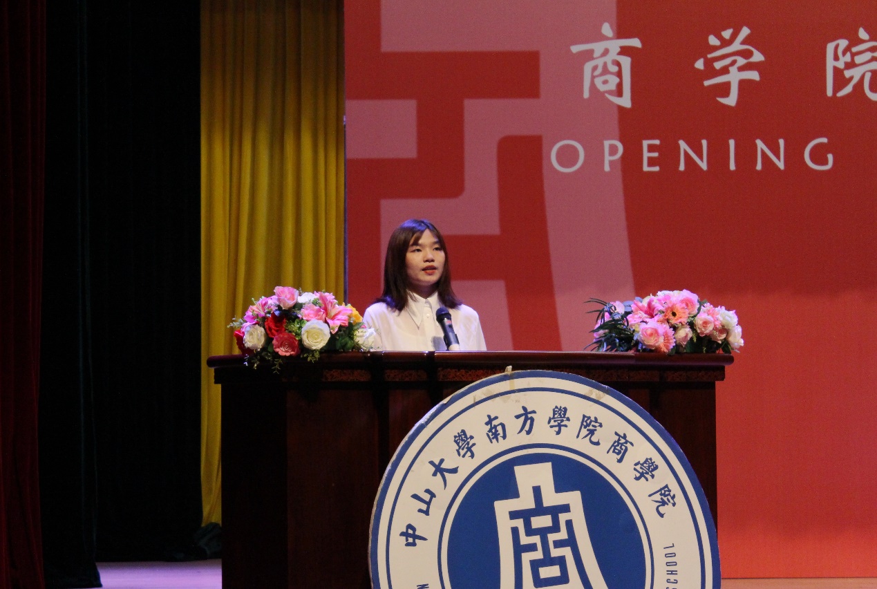 到了新生代表高畅同学上台发言,开始她先对我校迎新的学长学姐表示感谢,并对接下来四年大学生活充满期待,同时表示将会遵循“厚德、真理、忏思、拼搏”的校训,坚守初心,好好学习,勇于挑战创新,攻坚克难,提升人生目标与价值,为中大南方增光添彩,为祖国奉献自己的一份力量。