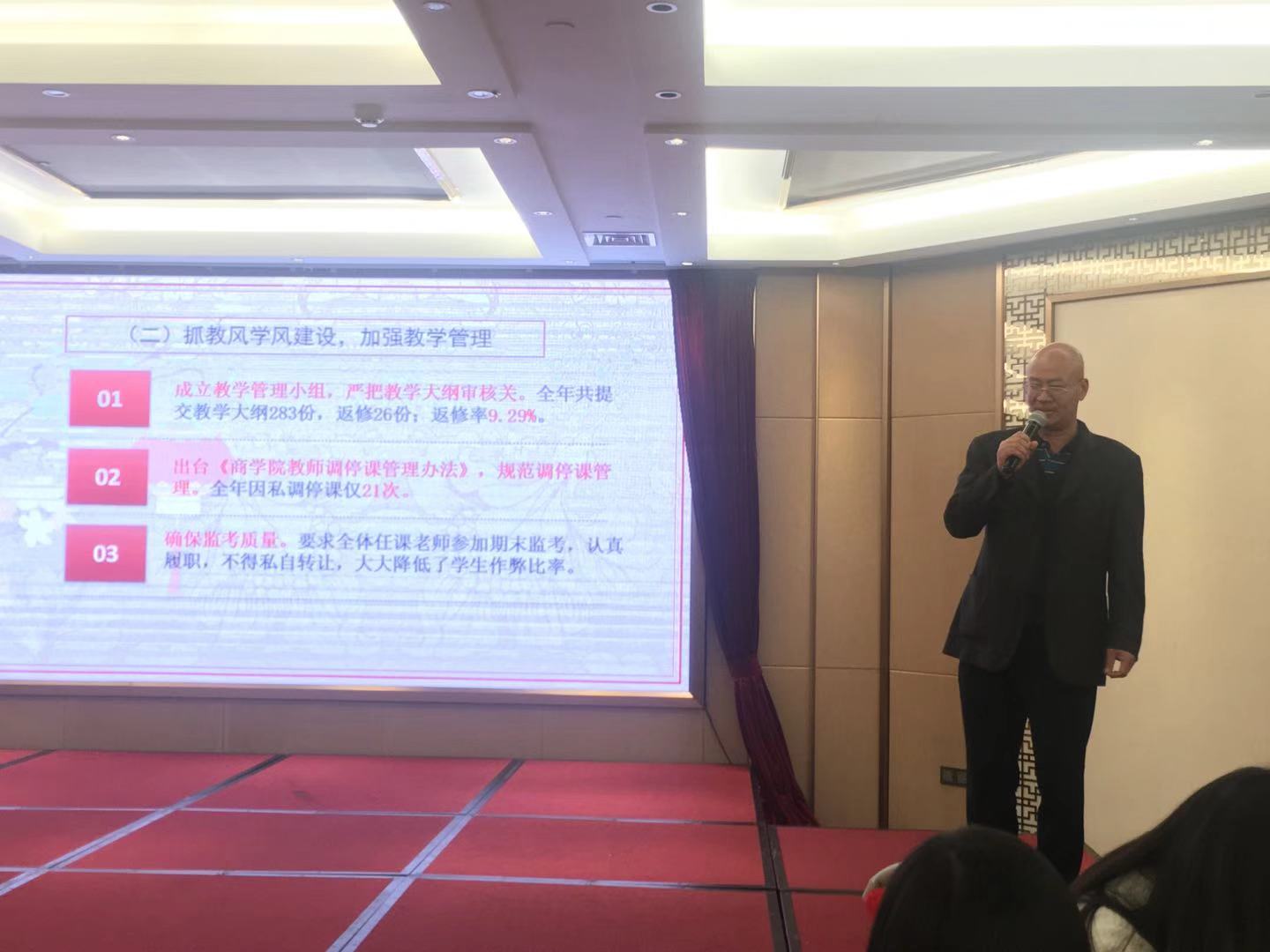 为表彰教学过程中表现优秀,树立典型,大会进行颁奖仪式,喻世友校长为获得教学质量优秀奖的孙明岩、萧裕中、林怡、高凯、黄华灵老师颁发获奖证书。