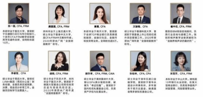 殿堂级百人师资团队,具备可与知名高校金融学院相媲美的研发实力、可与 海外名校金融教授相匹敌的教学能力、可与金融名企专家相比肩的实务能力,努 力为学员提供完善的学习资料、创新的学习体验、以及针对性的学习指导。