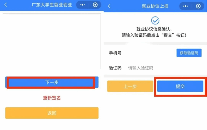 确认全部信息,进行签名确认。如有错误可点击“返回”到对应步骤中修改。确认无误后提交即完成就业协议书的申请。一旦学校审核后,毕业生和院校无法再修改信息,如需修改,请学生本人联系单位直接审核不通过退回学生直接修改。